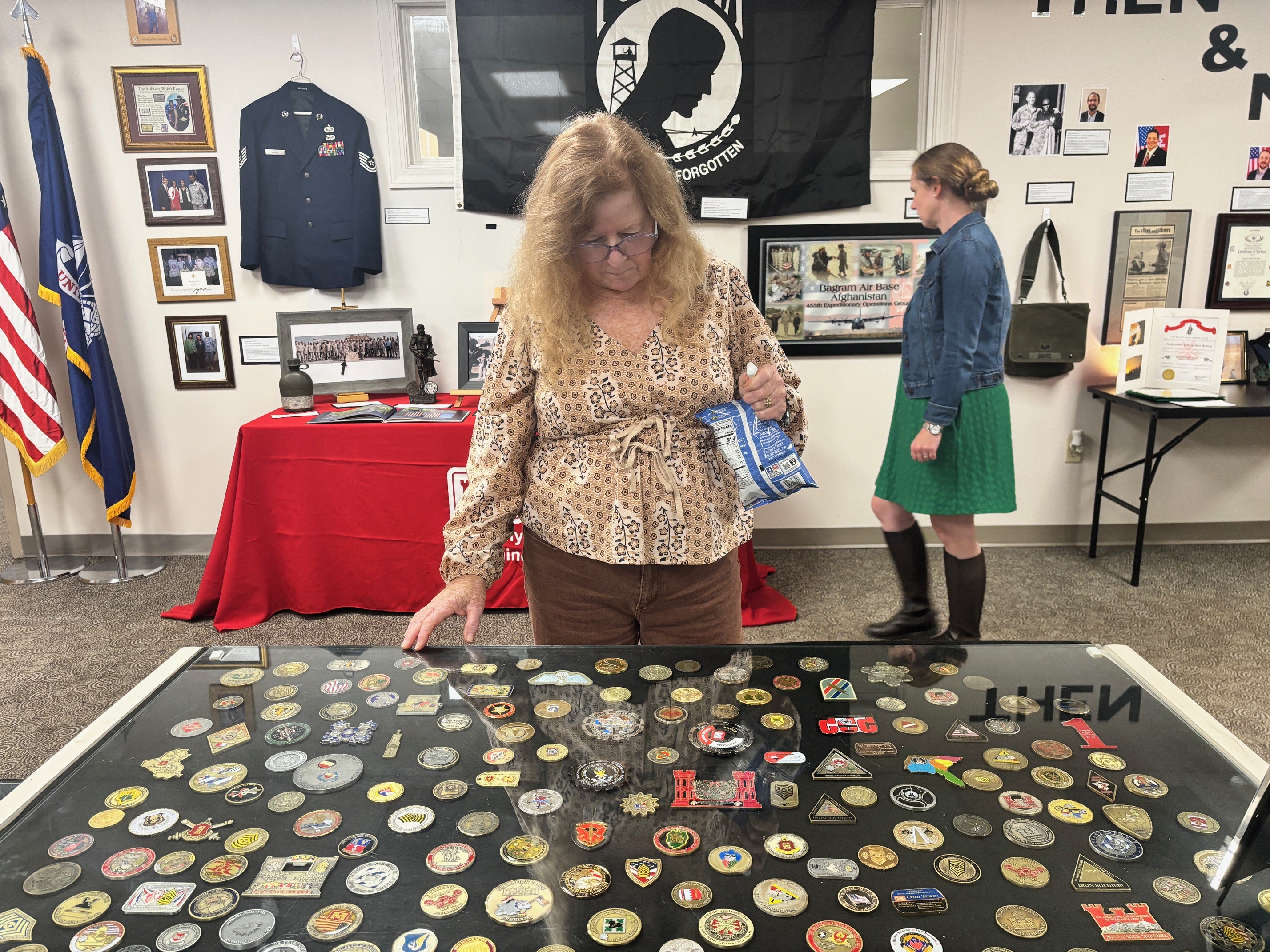 Among the many items on display are two Purple Hearts, a large challenge coin collection, a cast iron tassel from Saddam Hussein’s statue, and memorabilia from both World War I and World War II.